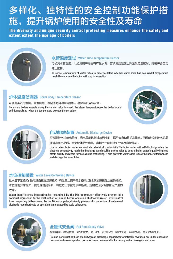 可偵測蒸汽的溫度,當溫度超出設定值時自動斷電停機,確保鍋爐運轉安全。