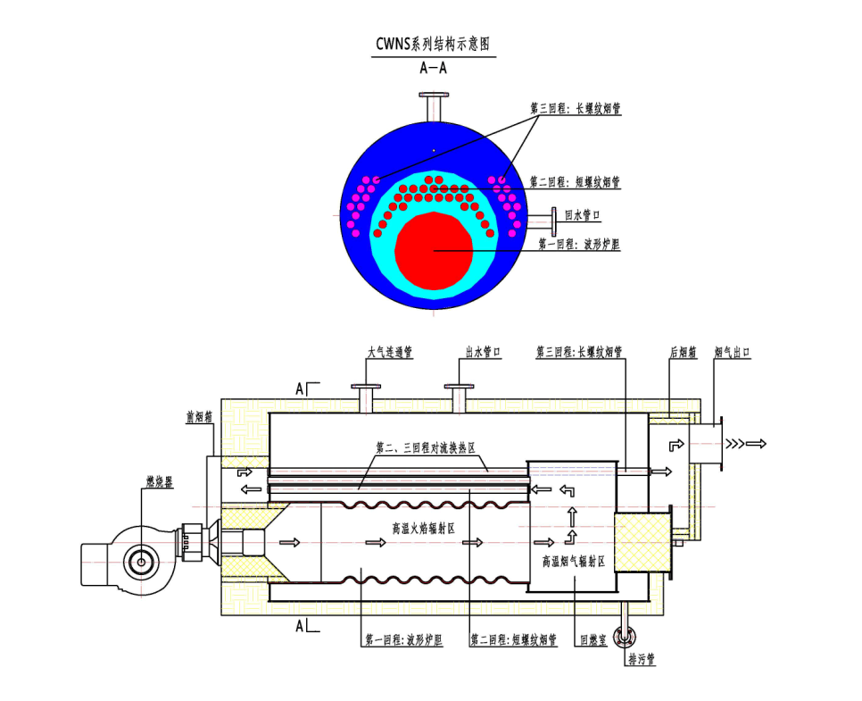產(chǎn)品簡介:WNS系列臥式燃甲醇(醇基燃料)蒸汽鍋爐為內燃三回程火管蒸汽鍋爐。采用偏置爐膽濕背式結構。高溫煙氣依次;沖刷第二及第三回程煙管,然后由后煙室經(jīng)煙囪排入大氣。鍋爐裝有活動的前后